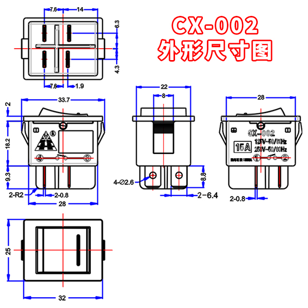 CX-002雙聯(lián)四腳二檔 翹板開關(guān) 電源開關(guān) 船型開關(guān)